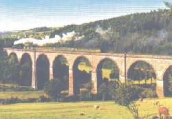 Himbächel-Viadukt, Erbaut 1881, Höhe 41m, Überbrückung 200m, Gesamtkosten 343615 Goldmark Baumeister Karl Weißhuhn aus Tropau, der sich nach Beendigung des Baues von Viadukt stürzte.