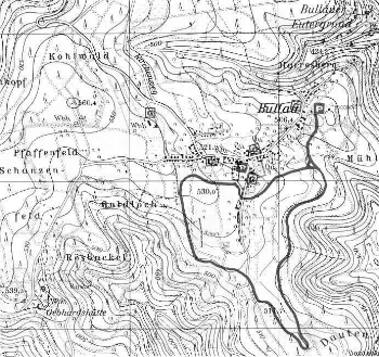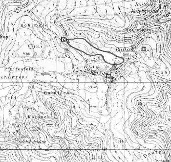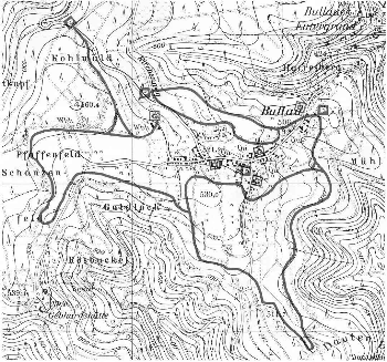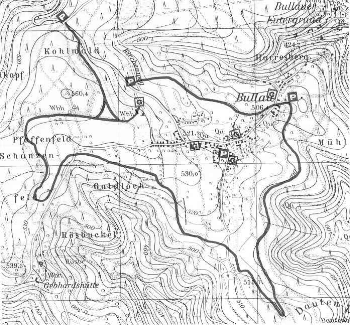 Von hier aus folgt sie den Spuren der Mühlbergloipe, zweigt dann in westlicher Richtung von dieser ab und kreuzt die Straße zur Gebhardtshütte. Danach zieht sie eine Schleife über das Pfaffenfeld zum höchsten Punkt des Langlaufgebietes (ca. 550m ü.d.M.) Von hier aus hat man bei klarem Winterwetter einen herrlichen Weitblick zu den südlichen Odenwaldbergen. Nun sind es nur noch 250m bis zum Ausgangspunkt dieser Loipe „Rund um Bullau“